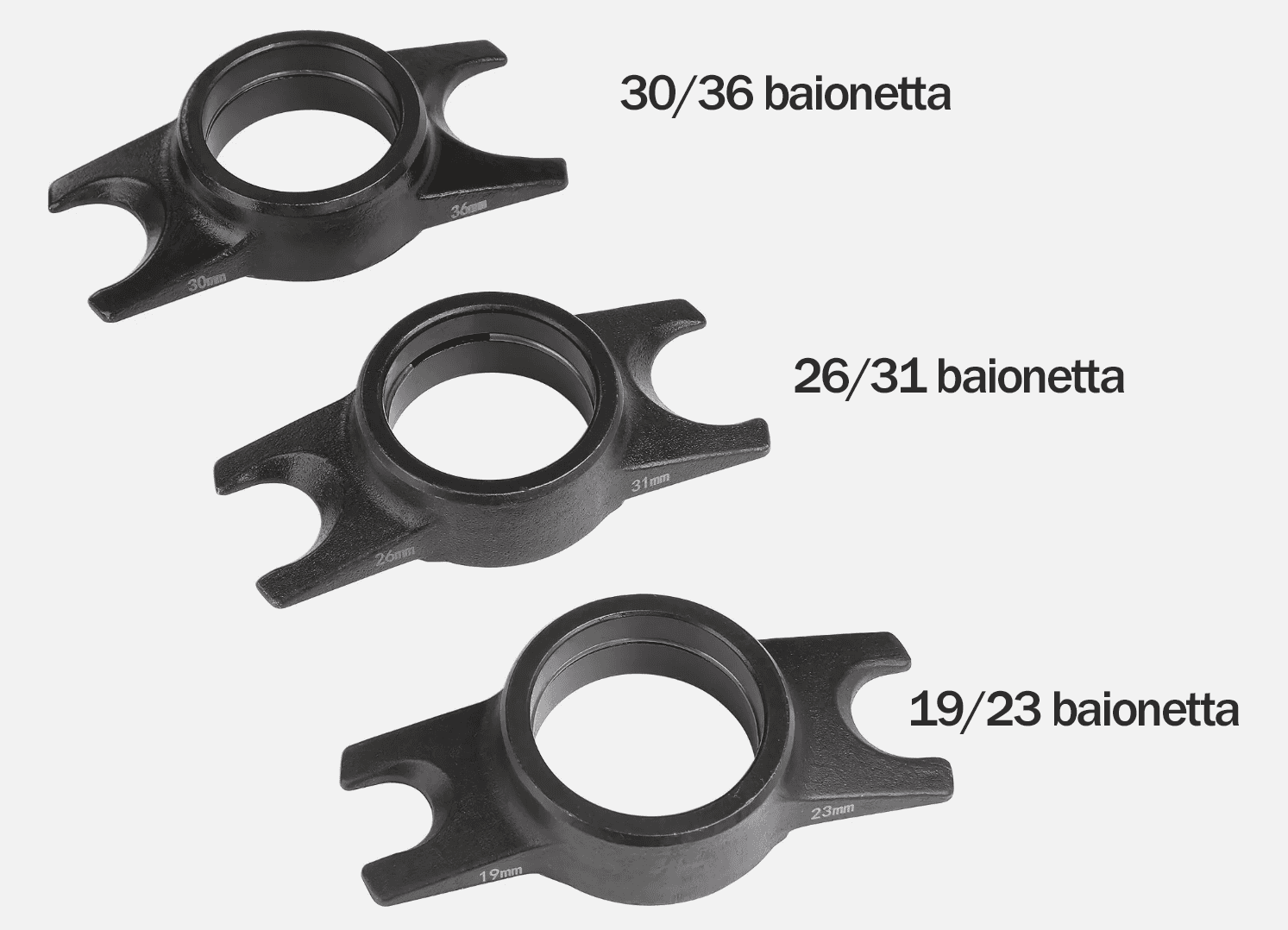 Tre dimensioni di baionetta (19/23, 26/31, 30/36)